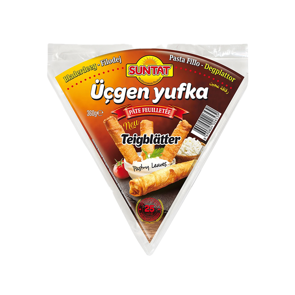 Découvrez les délicieux Yufka Triangle Suntat de 360g, une spécialité de la marque Suntat, disponibles dans notre rayon boulangerie. Parfaits pour vos repas en famille ou entre amis, ces triangles croustillants et savoureux sauront ravir vos papilles à coup sûr.nnFabriqués avec des ingrédients de qualité, les Yufka Triangle Suntat sont une excellente option pour un encas gourmand ou un repas rapide. Leur format pratique et leur goût authentique en font un incontournable de votre cuisine.nnQue vous les dégustiez seuls ou accompagnés de vos garnitures préférées, ces délicieux triangles de Yufka sauront vous séduire par leur texture croustillante et leur saveur délicate.nnN’attendez plus pour découvrir ce produit phare de la marque Suntat dans notre supermarché. Faites-vous plaisir et régalez-vous avec les Yufka Triangle Suntat pour une expérience gustative unique et mémorable.nnNe ratez pas l’occasion de goûter à ces délices turcs traditionnels et commandez dès maintenant vos Yufka Triangle Suntat de 360g chez nous. Offrez-vous un moment de plaisir culinaire avec des produits de qualité, disponibles en magasin pour votre plus grand bonheur.