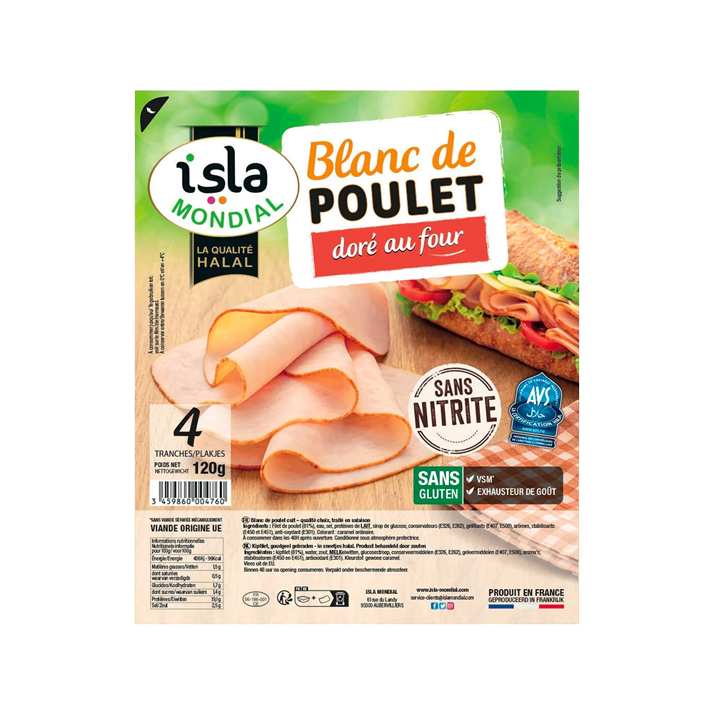 Au-delà de sa praticité, le Blanc de Poulet Doré ISLA MONDIAL s’adresse à tous ceux qui recherchent une charcuterie halal de qualité supérieure. Conditionné en format 120 g, il se conserve facilement et s’adapte parfaitement aux besoins des familles comme des consommateurs pressés.